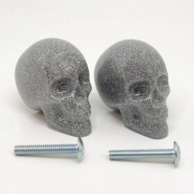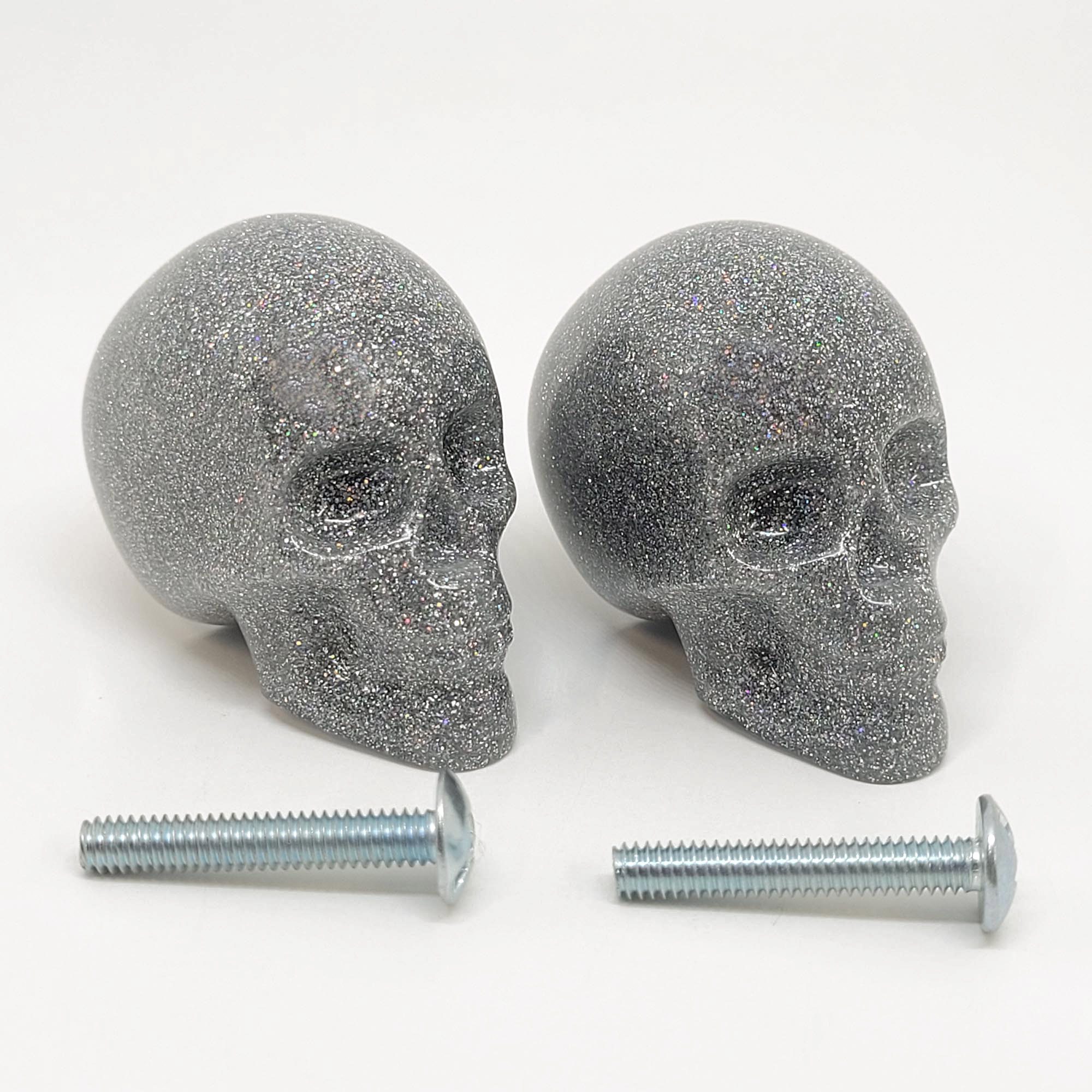 This 2 piece set of skull door knobs/drawer knobs with silver holographic glitter are 100% handmade in the united states.