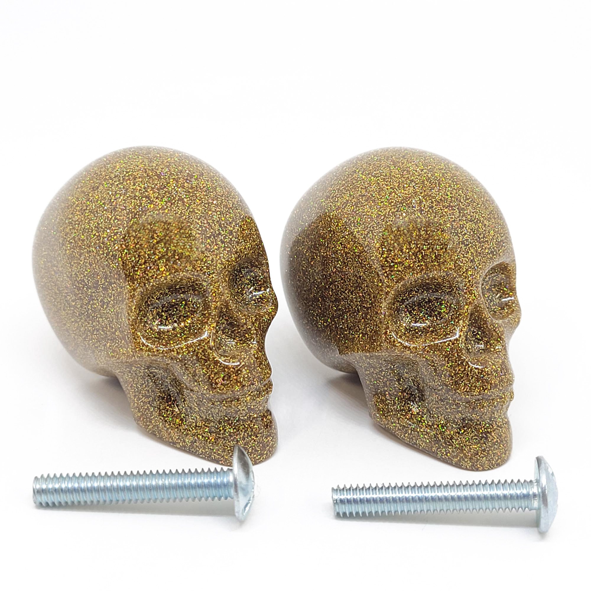This 2 piece set of skull door knobs/drawer knobs with gold holographic glitter are 100% handmade in the united states.