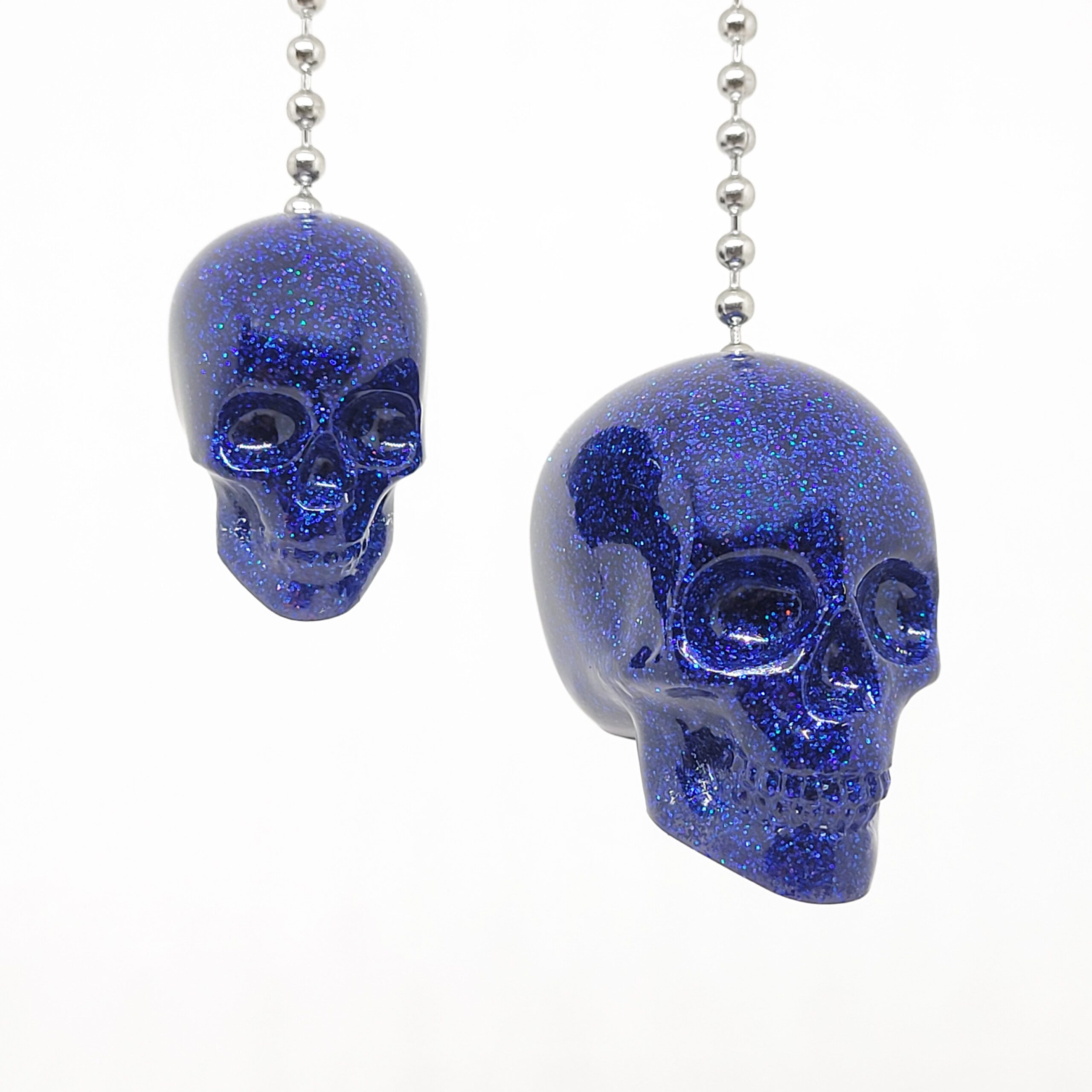 The blue glitter skull fan pulls are made with blue glitter and come with an 11.5 inch metal chain with a clasp to attach to any fan or light fixture with a pull type switch.