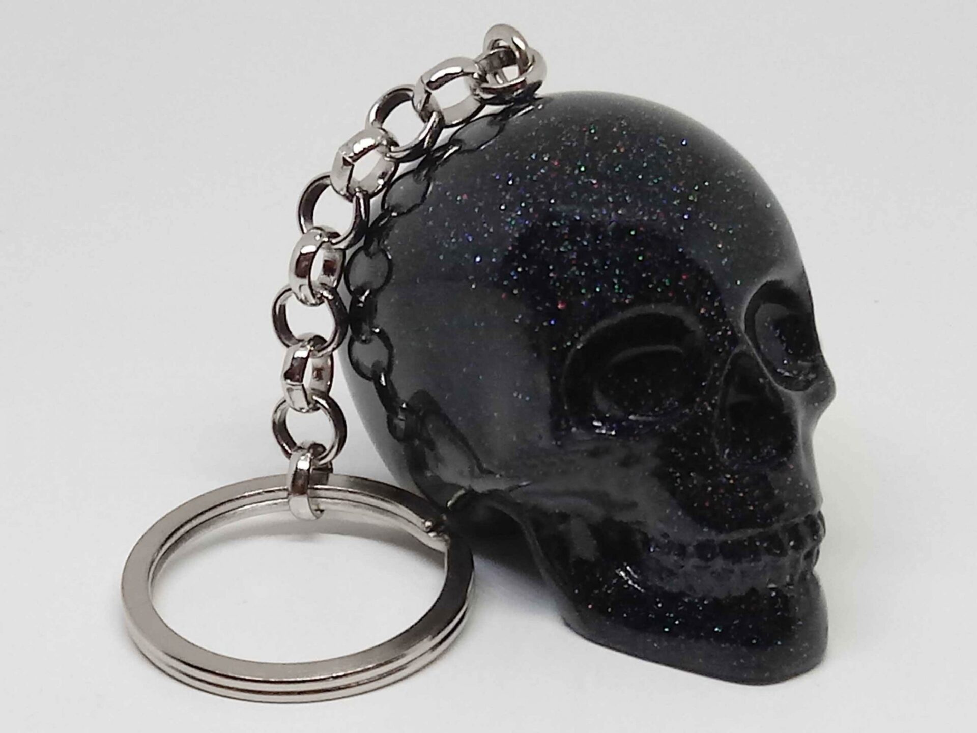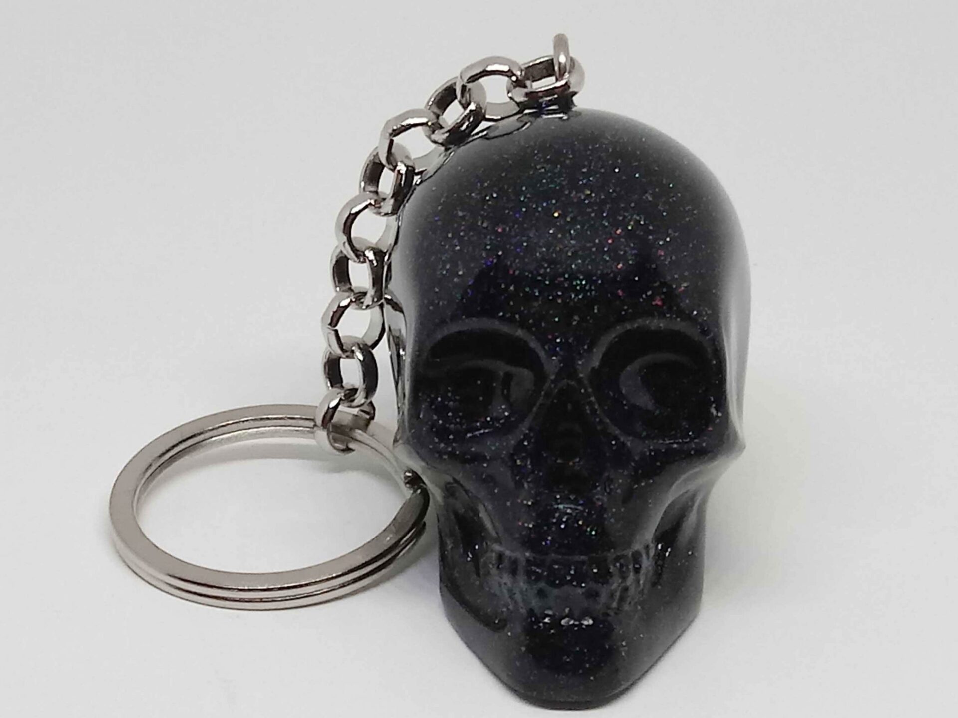 This handmade punk skull keychain is a bold black glitter skull keychain crafted for lovers of gothic, Halloween, and edgy styles. I personally hand measure, pour, and mix the 2-part liquid epoxy resin into my own handmade silicone molds to cure for 24-48 hours in industrial grade pressure pots. Then they are de-molded, sanded, buffed, and polished to shiny perfection, leaving no cast lines or bubbles in the resin for a stunning and very unique resin skull product as a result.