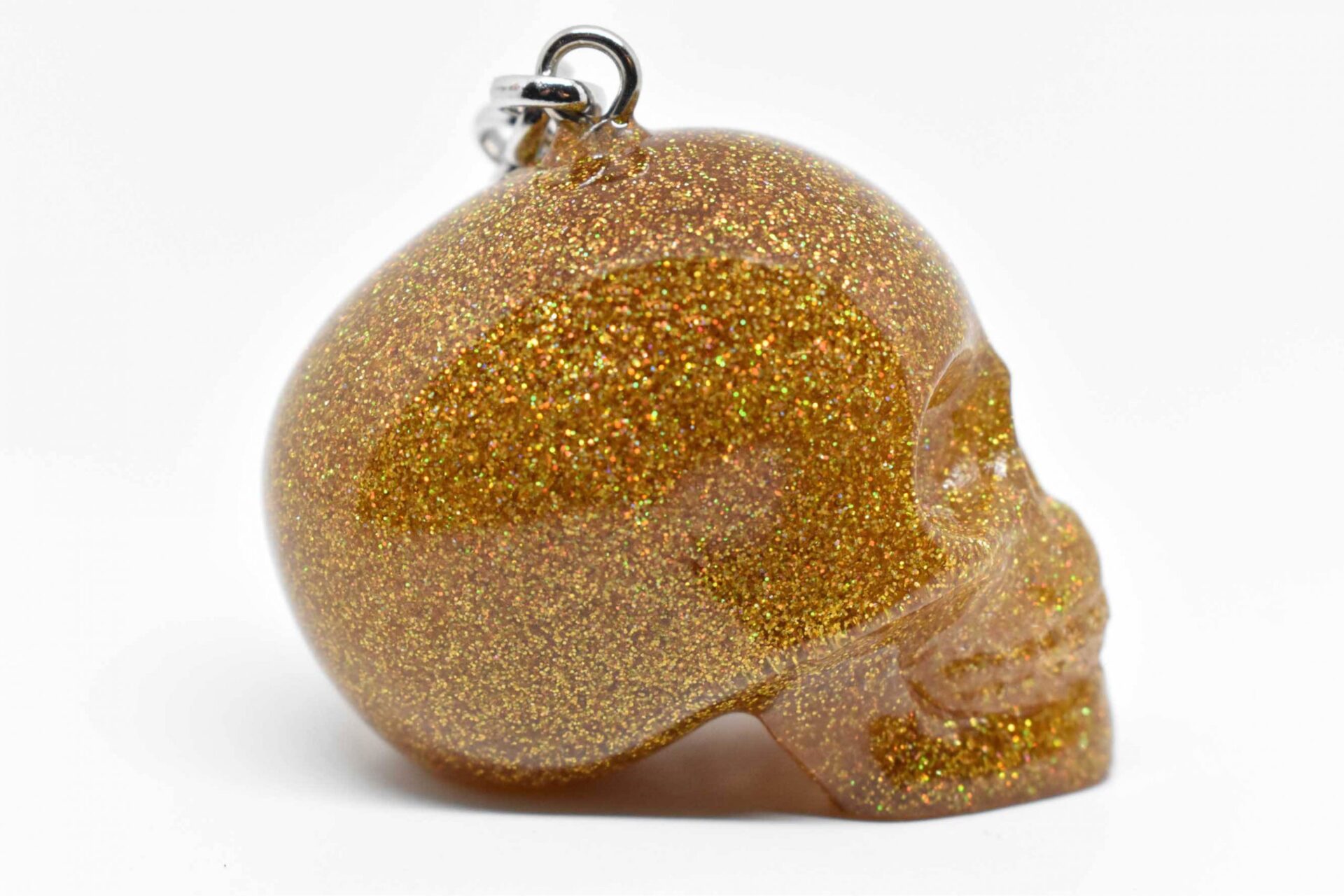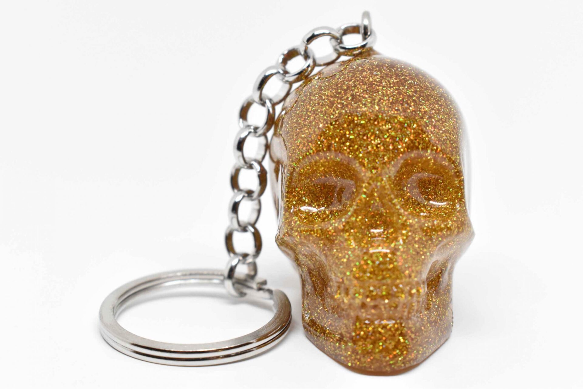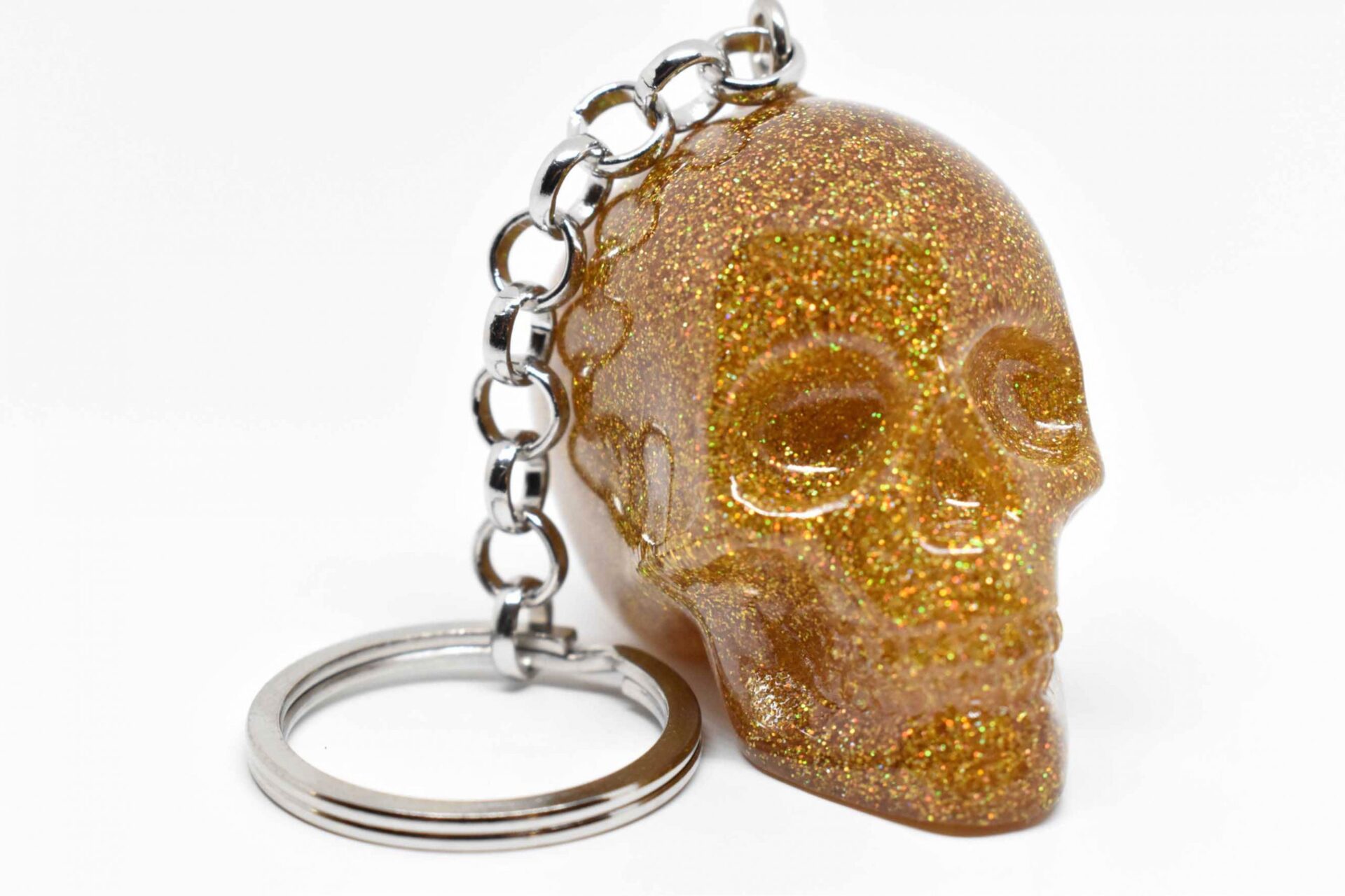 This gold glitter skull keychain is exactly what I was looking for! It adds a touch of glamour to my car keys, and I get so many compliments.