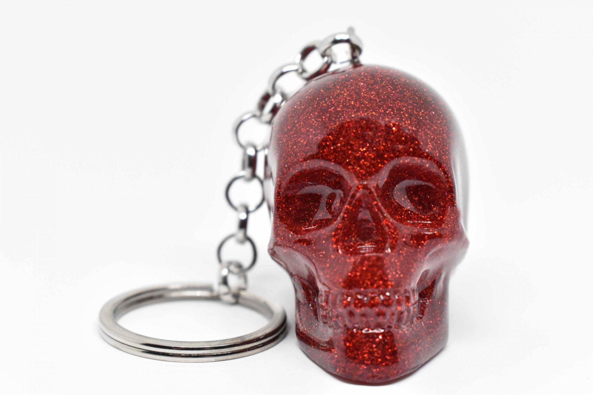 Each keychain is proudly handmade in Kentucky, ensuring top-tier artistry and quality. I personally hand measure, pour and mix the 2-part liquid epoxy resin into my own handmade silicone molds to cure for 24-48 hours in industrial grade pressure pots. Then they are de-molded, sanded, buffed and polished to shiny perfection, leaving no cast lines or bubbles in the resin for a stunning and very unique resin skull product as a result. The red glitter finish adds an irresistible sparkle that makes this accessory both eye-catching and durable. Whether clipped to my keys, backpack, or belt loop, it delivers an unmistakable touch of gothic charm.