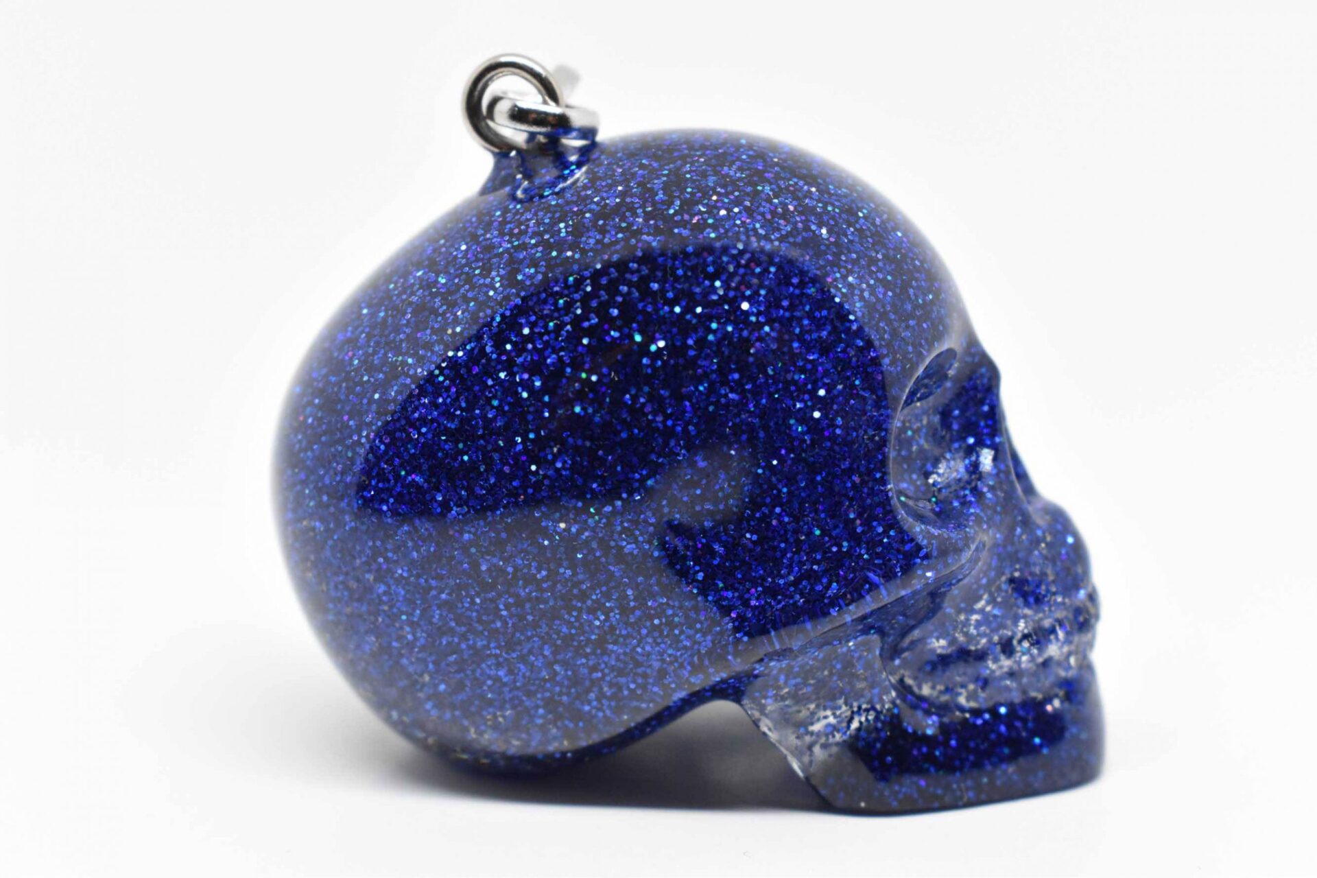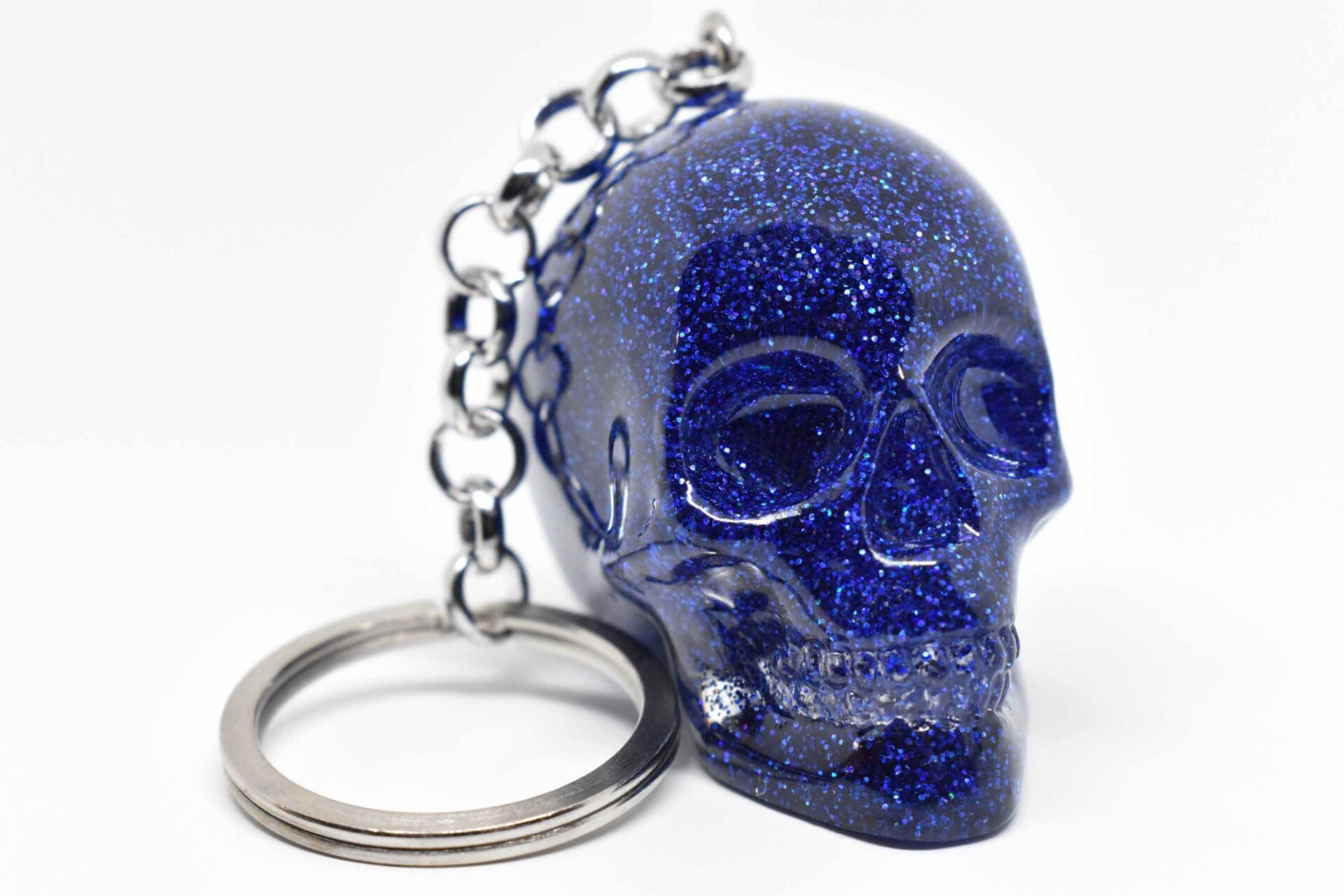 This blue glitter skull keychain is perfect for my keys. The glitter and resin give it a really nice shine, and it seems very durable.