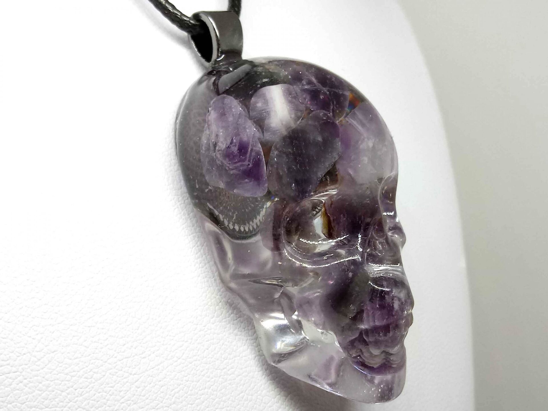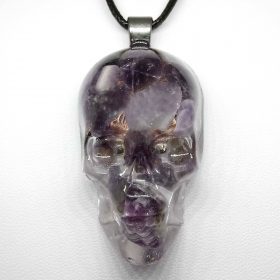 It is created using high quality amethyst gemstones inside the resin skull necklace.