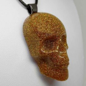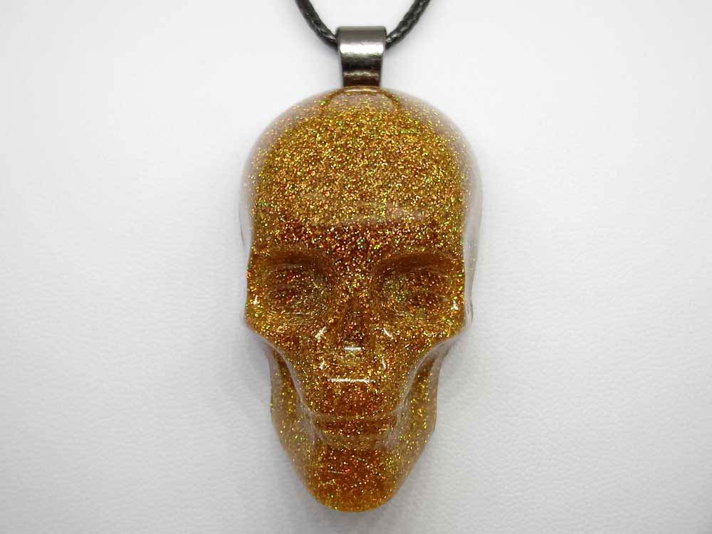 It is created using gold holographic (holo) glitter inside the skull necklace.