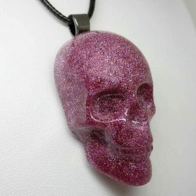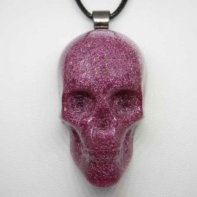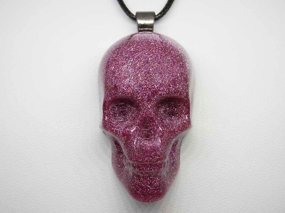 It is created using pink holographic (holo) glitter inside the skull necklace.
