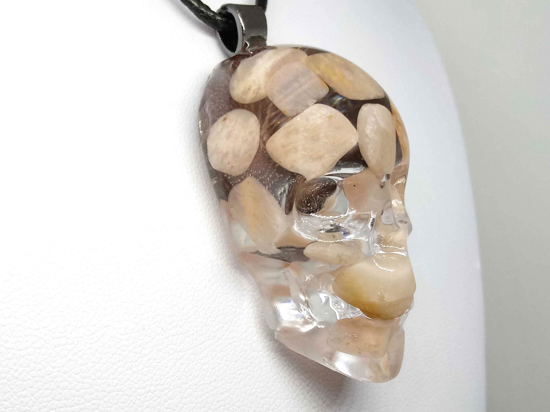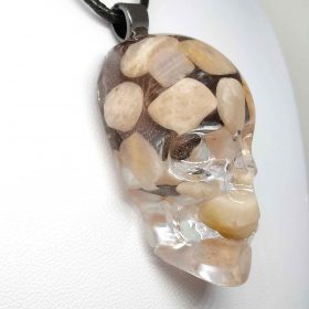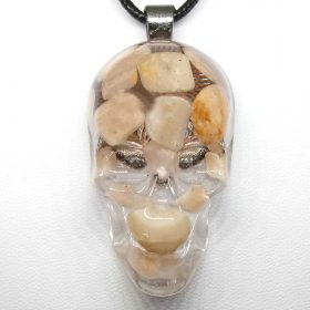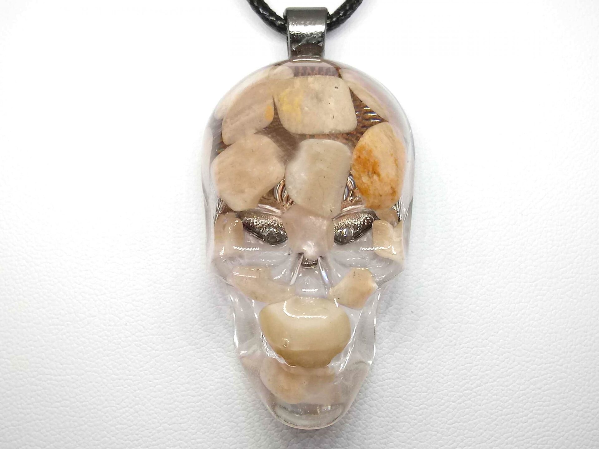 It is created using high quality sun stone gemstones inside the resin skull necklace.